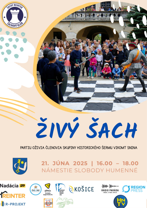 V sobotu sa program sústreďuje na popoludnie a večer. Pred Mestským kultúrnym strediskom ožije živý šach – na veľkej šachovnici sa figuríny stávajú ľuďmi a partiu spestria aj šermiarske vystúpenia. Deti poteší maľovanie na tvár.