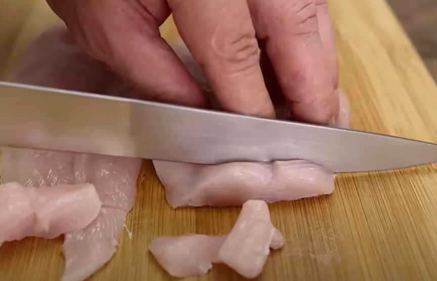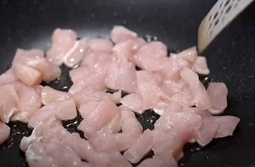 - Kuracie mäso nakrájame na menšie kúsky a na panvici začneme opekať na troche oleja.