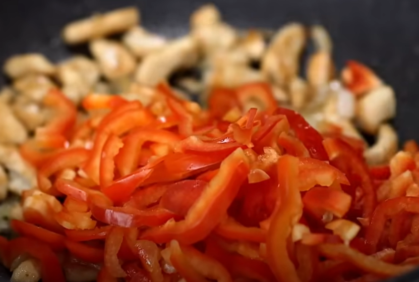 - Pridáme na kúsky nakrájanú papriku a cibuľu a chvíľu spolu restujeme.