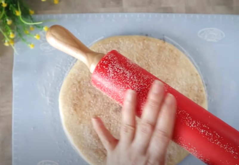 - Cesto vypracujte rukami a rozvaľkajte na vrstvu hrubú približne 1 cm. Cukor zmiešajte so škoricovým cukrom a posypte ním povrch cesta.
