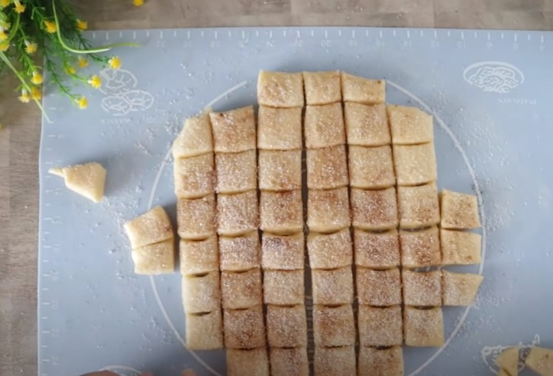 - Cesto nakrájajte na štvorčeky o veľkosti približne 2 × 2 cm a poukladajte ich na plech vystlaný papierom na pečenie vedľa seba.