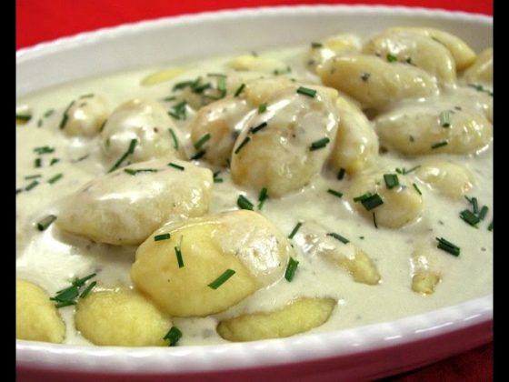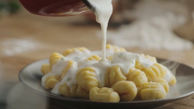 - Hotové gnocchi scedíme, vložíme do misy a prelejeme pripravenou omáčkou. Podávame horúce, ideálne s nasekanými čerstvými bylinkami navrchu.