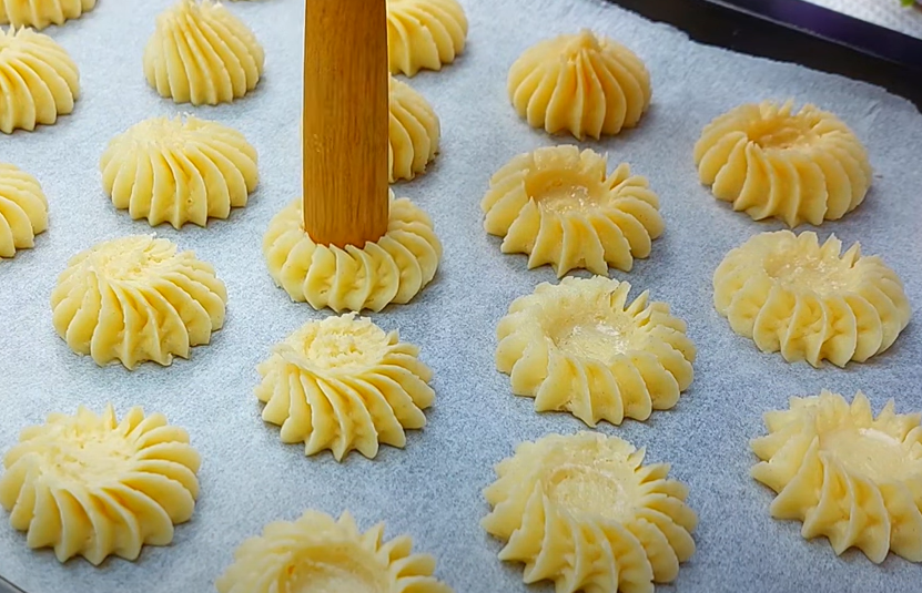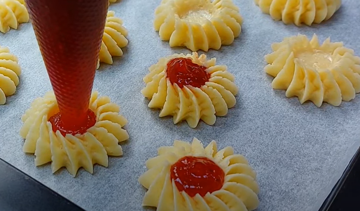- Na plech vyložený papierom na pečenie tvarujeme malé sušienky. Do stredu každej urobíme palcom alebo rúčkou varechy jamku, ktorú naplníme džemom.