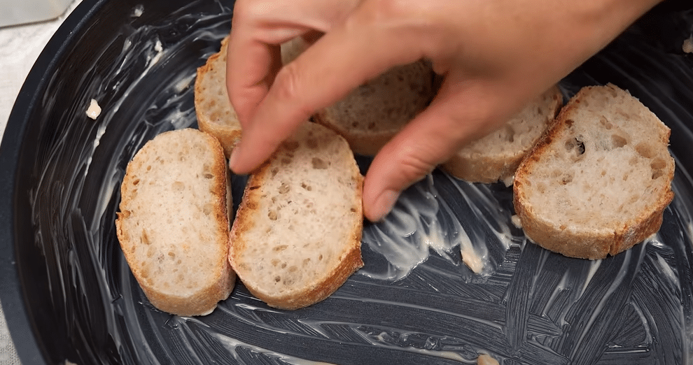 - Zmes dôkladne premiešajte a rovnomerne ňou polejte bagetky na panvici.