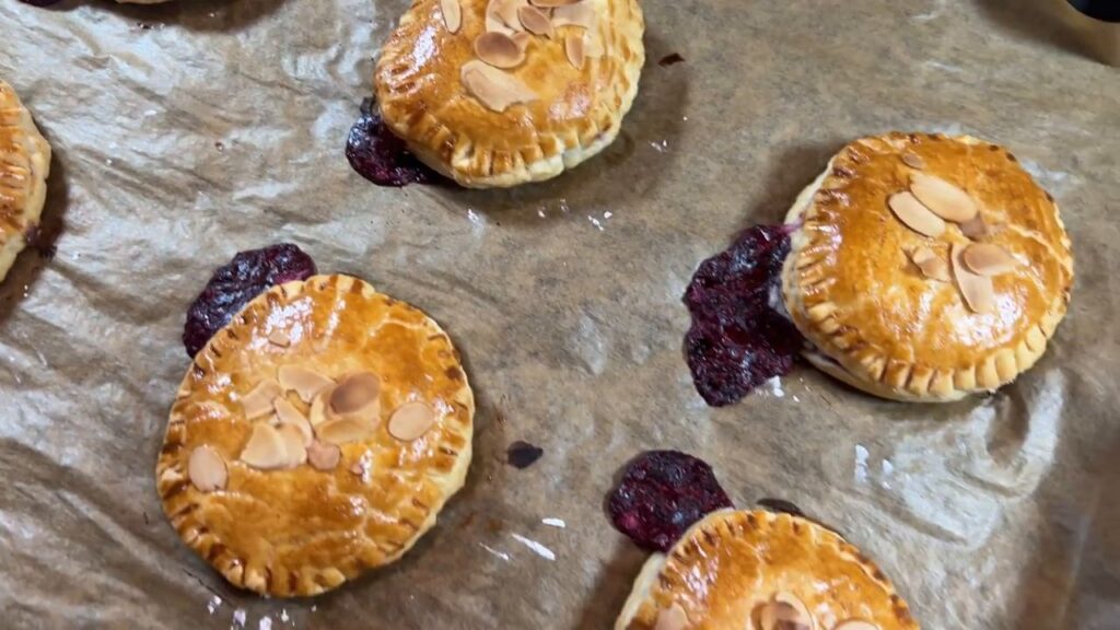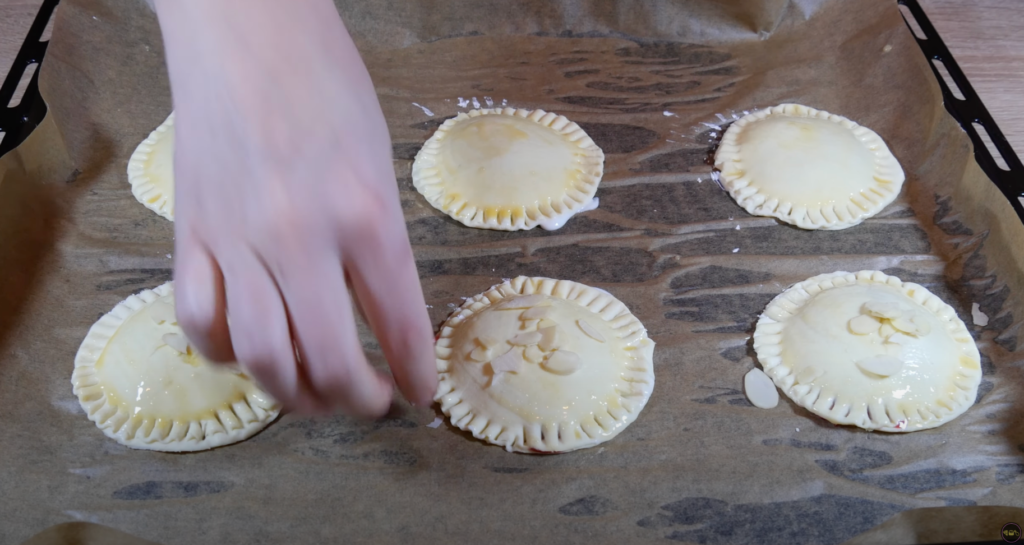 Taštičky potrite rozšľahaným vajíčkom alebo žĺtkom a posypte mandľovými lupienkami. - Pečenie: