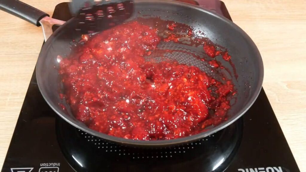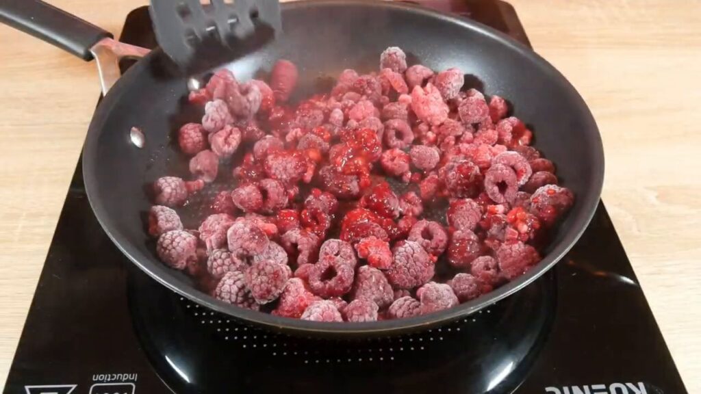 Mrazené maliny dajte do panvice a na miernom ohni ich krátko povarte. Pridajte kukuričný škrob, dobre premiešajte a varte, kým maliny zmäknú a zmes zhustne. Potom nechajte mierne vychladnúť. - Krém: