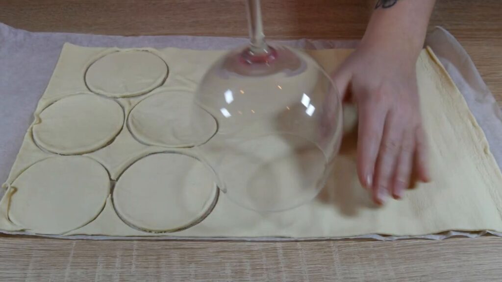 Lístkové cesto rozvaľkajte a pomocou pohára (napr. od červeného vína) vykrajujte kolieska. Tie poukladajte na plech vystlaný papierom na pečenie, s malými rozostupmi. - Plnenie: