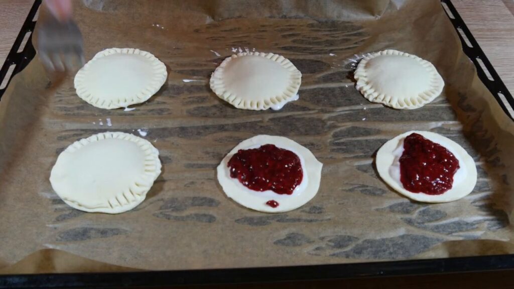 Do stredu každej spodnej časti kolieska dajte trochu krému a malinovú náplň. Potom prikryte druhým kolieskom cesta a okraje pevne spojte vidličkou – vytvoríte tak vlnkovaný okraj. - Potretie a zdobenie: