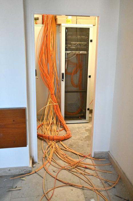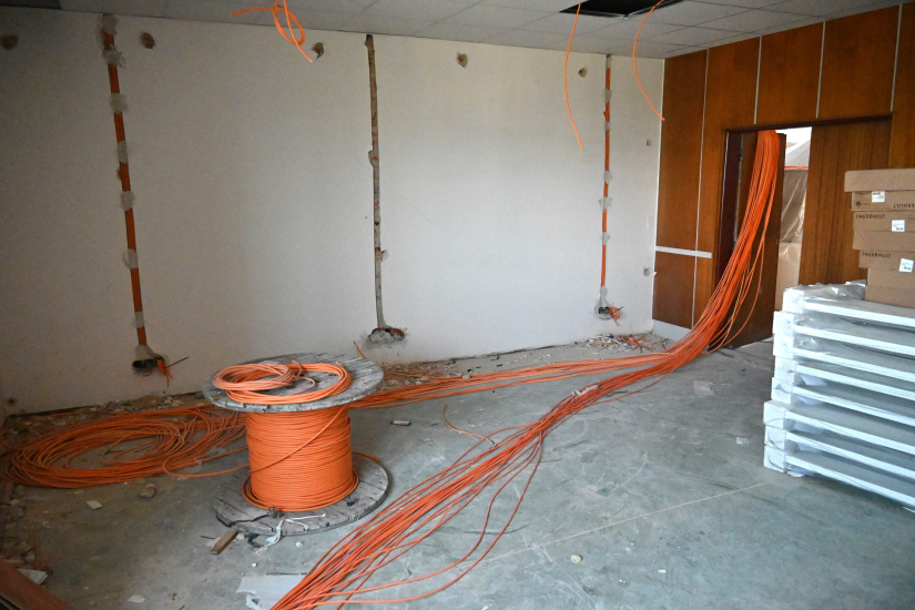 - V západnej časti budovy prebiehajú práce na inštaláciách: rozvody kúrenia, elektroinštalácia, vodovod, kanalizácia, dátové siete, maľby a podlahy.