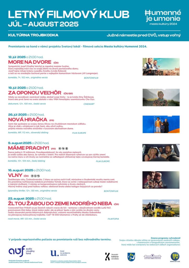 Organizátori odporúčajú priniesť si deku alebo skladaciu stoličku. Premietania sa konajú len za priaznivého počasia.