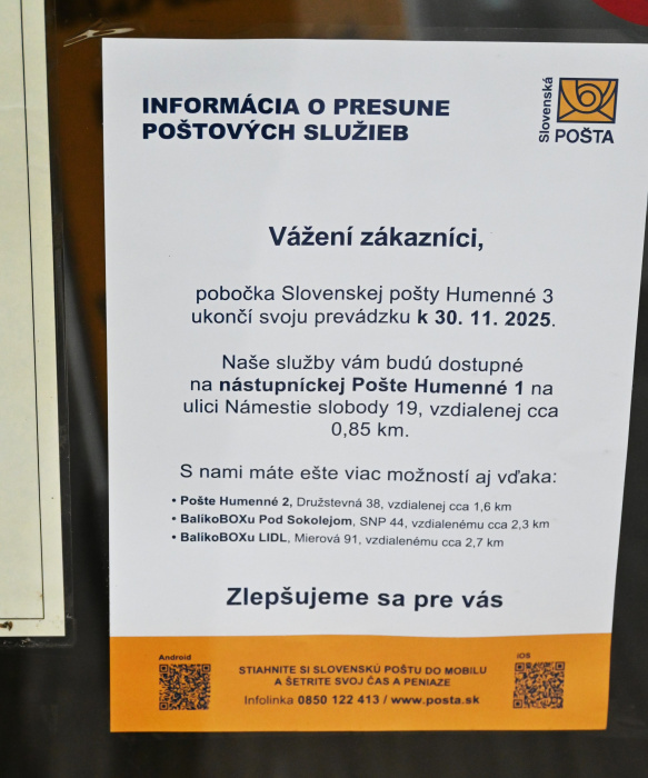Od 1.12.2025 dôjde k ukončeniu prevádzky Pošty Humenné 3 (Námestie slobody 46), ktoré schválil Úrad pre reguláciu elektronických komunikácií a poštových služieb. Tento krok je súčasťou transformácie Slovenskej pošty.