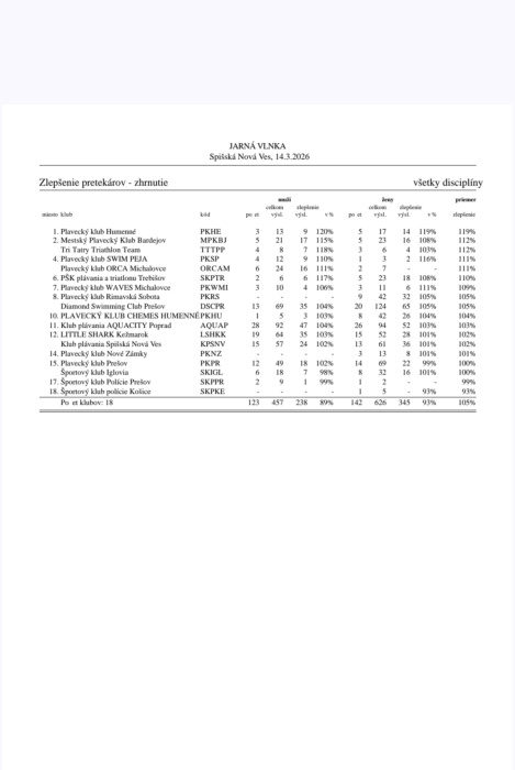Aj ďalší plavci Plaveckého klubu Humenné Beatrice Crea, Veronika Bošková a Sebastián Kimak predviedli kvalitné výkony, ktoré znamenali zlepšenia osobných rekordov a pričinili sa o to, že Plavecký klub Humenné sa umiestnil na prvom mieste medzi klubmi v celkovom zlepšení sa pretekárov. Gratulujeme všetkým plavcom k výborným výkonom a ďakujeme za skvelú reprezentáciu Plaveckého klubu Humenné a mesta Humenné.